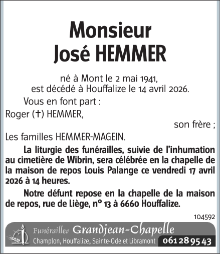 Décédé à Houffalize (6660) le mardi 14 avril 2026 à l'âge de 84 ans
