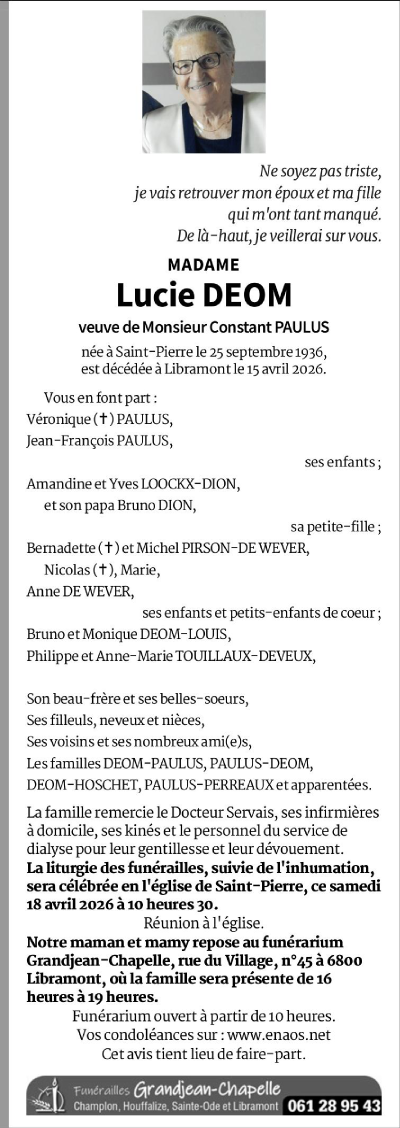 Décédée à Libramont (6800) le mercredi 15 avril 2026 à l'âge de 89 ans