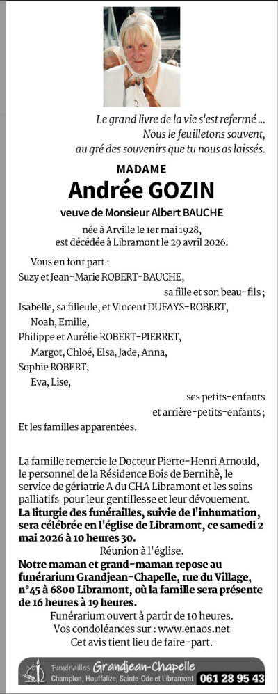 Décédée à Libramont (6800) le mercredi 29 avril 2026 à l'âge de 97 ans