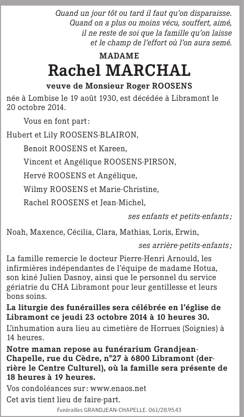 Décédée à Libramont (6800) le lundi 20 octobre 2014 à l'âge de 84 ans