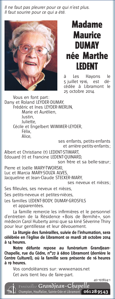 Décédée à Libramont (6800) le samedi 25 octobre 2014 à l'âge de 98 ans