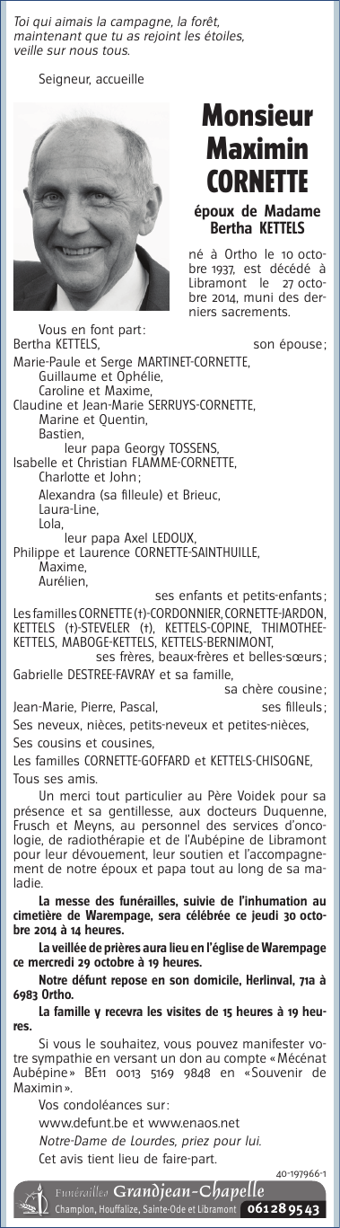 Décédé à Libramont (6800) le lundi 27 octobre 2014 à l'âge de 77 ans