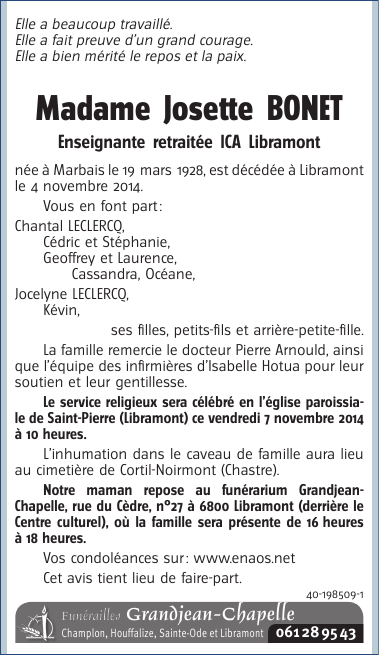 Décédée à Libramont (6800) le mardi 4 novembre 2014 à l'âge de 86 ans