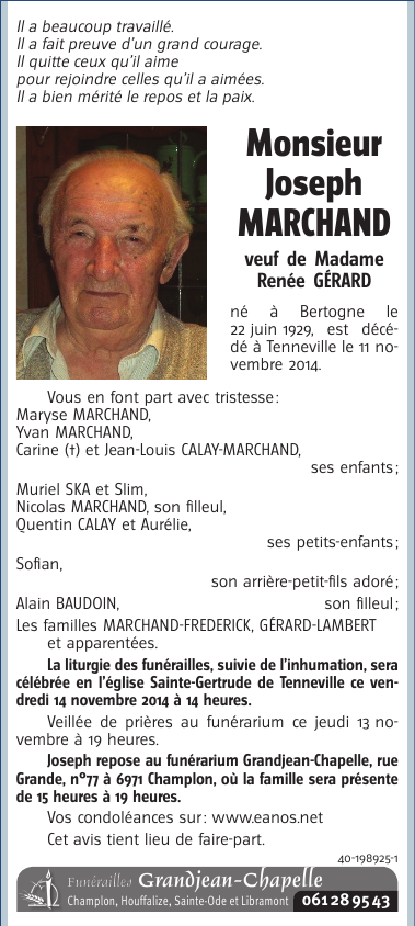 Décédé à Tenneville (6970) le mardi 11 novembre 2014 à l'âge de 85 ans