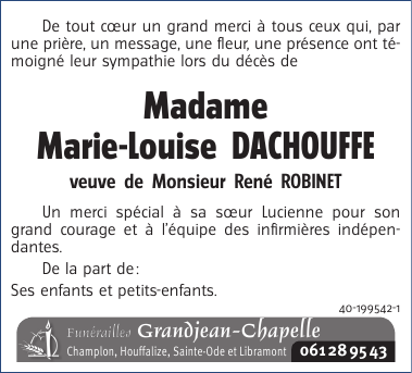 Décédée à Libramont (6800) le dimanche 19 octobre 2014 à l'âge de 90 ans