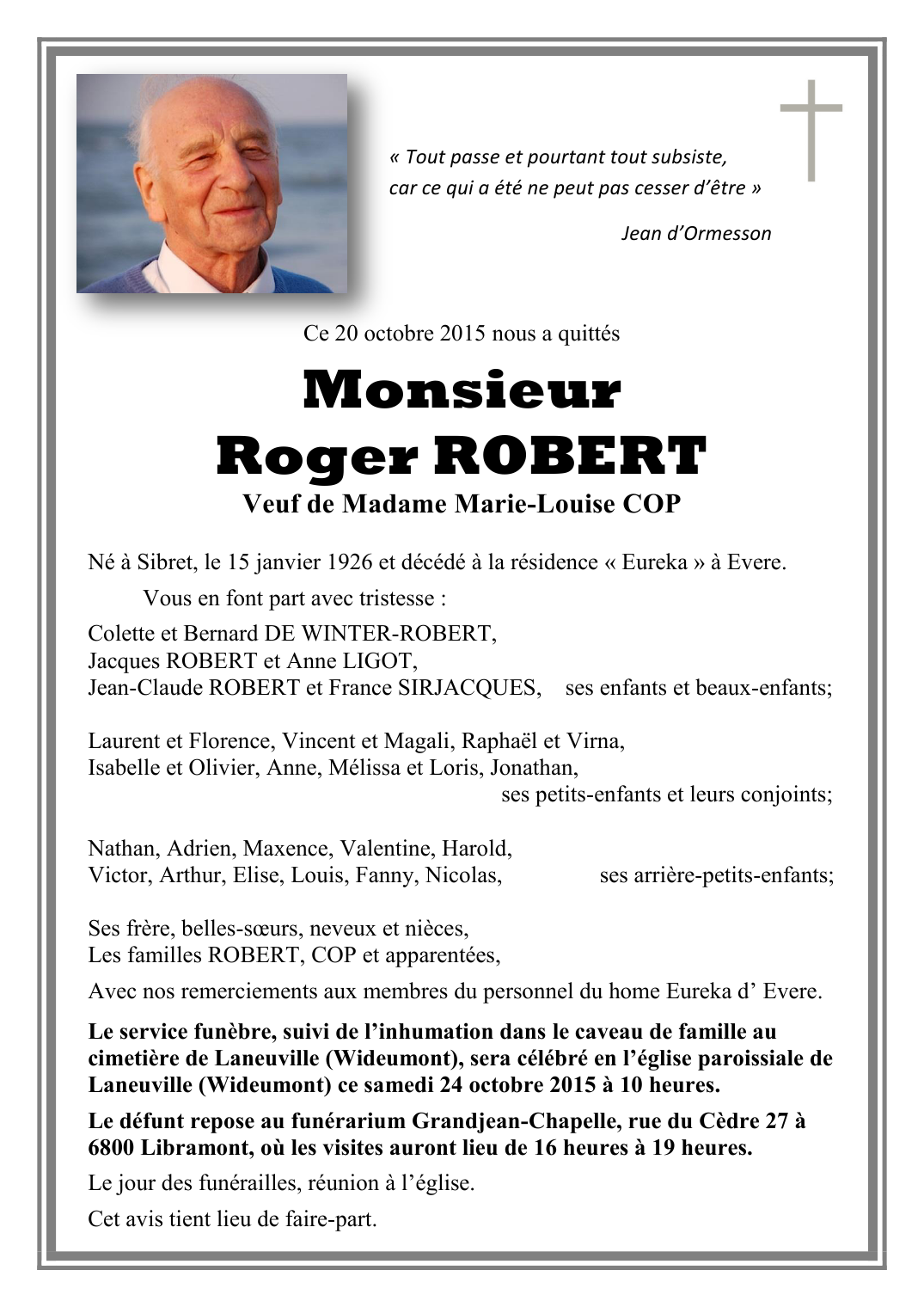 Décédé à Evere (1140) le mardi 20 octobre 2015 à l'âge de 89 ans