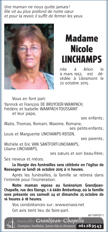 Décédée à Libramont (6800) le jeudi 22 octobre 2015 à l'âge de 63 ans