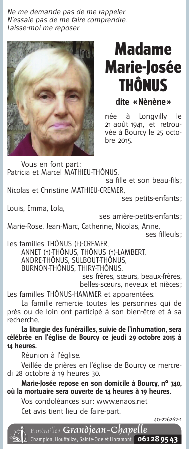 Décédée à Bourcy (6600) le dimanche 25 octobre 2015 à l'âge de 74 ans