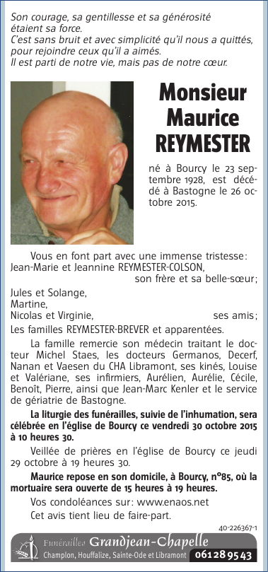 Décédé à Bastogne (6600) le lundi 26 octobre 2015 à l'âge de 87 ans