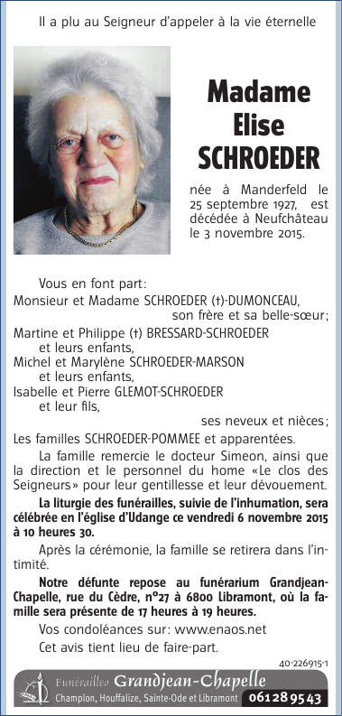 Décédée à Neufchâteau (6840) le mardi 3 novembre 2015 à l'âge de 88 ans