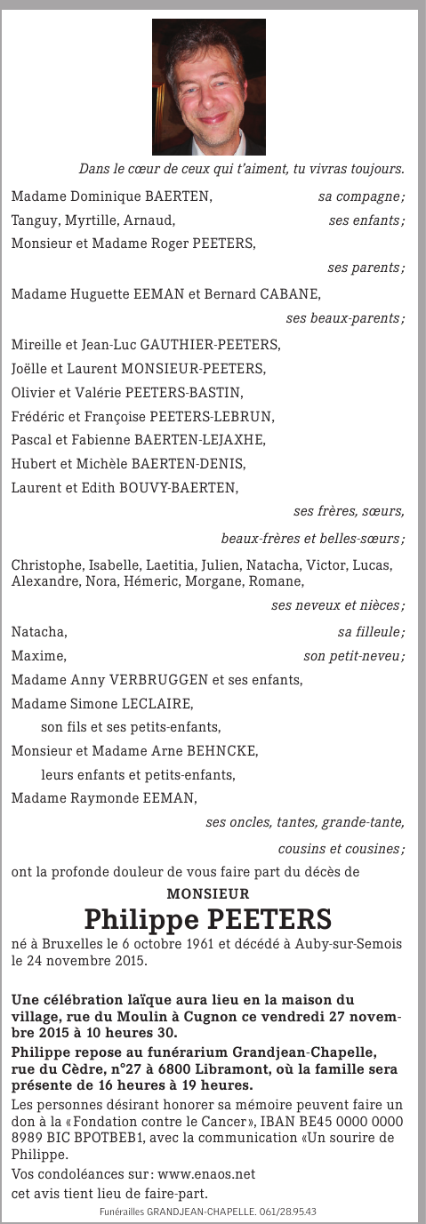 Décédé à Auby-sur-Semois (6880) le mardi 24 novembre 2015 à l'âge de 54 ans