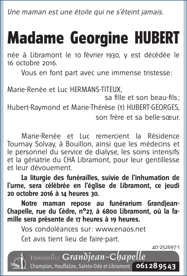 Décédée à Libramont (6800) le dimanche 16 octobre 2016 à l'âge de 86 ans
