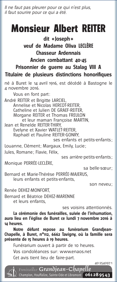Décédé à Bastogne (6600) le vendredi 4 novembre 2016 à l'âge de 100 ans