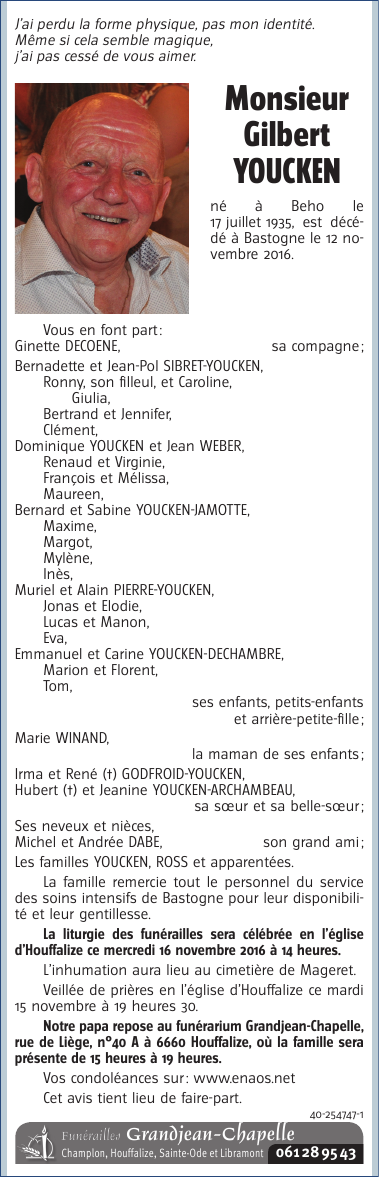 Décédé à Bastogne (6600) le samedi 12 novembre 2016 à l'âge de 81 ans