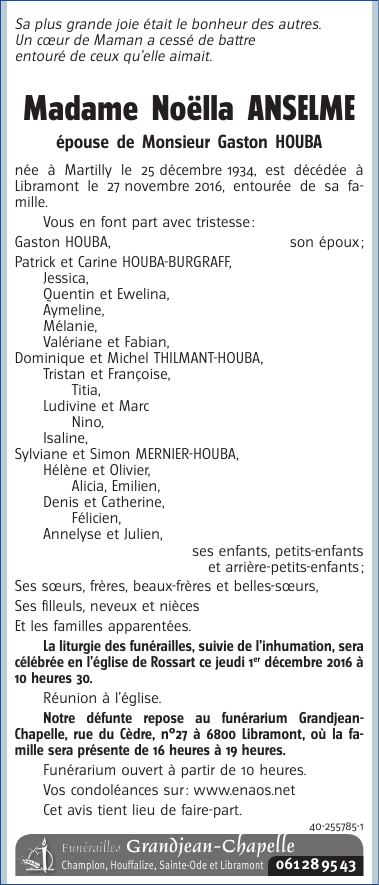 Décédée à Libramont (6800) le dimanche 27 novembre 2016 à l'âge de 81 ans