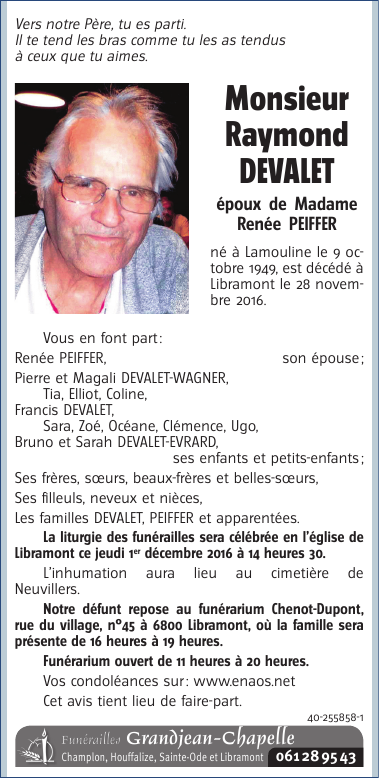 Décédé à Libramont (6800) le lundi 28 novembre 2016 à l'âge de 67 ans