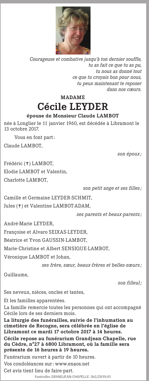 Décédée à Libramont (6800) le vendredi 13 octobre 2017 à l'âge de 57 ans