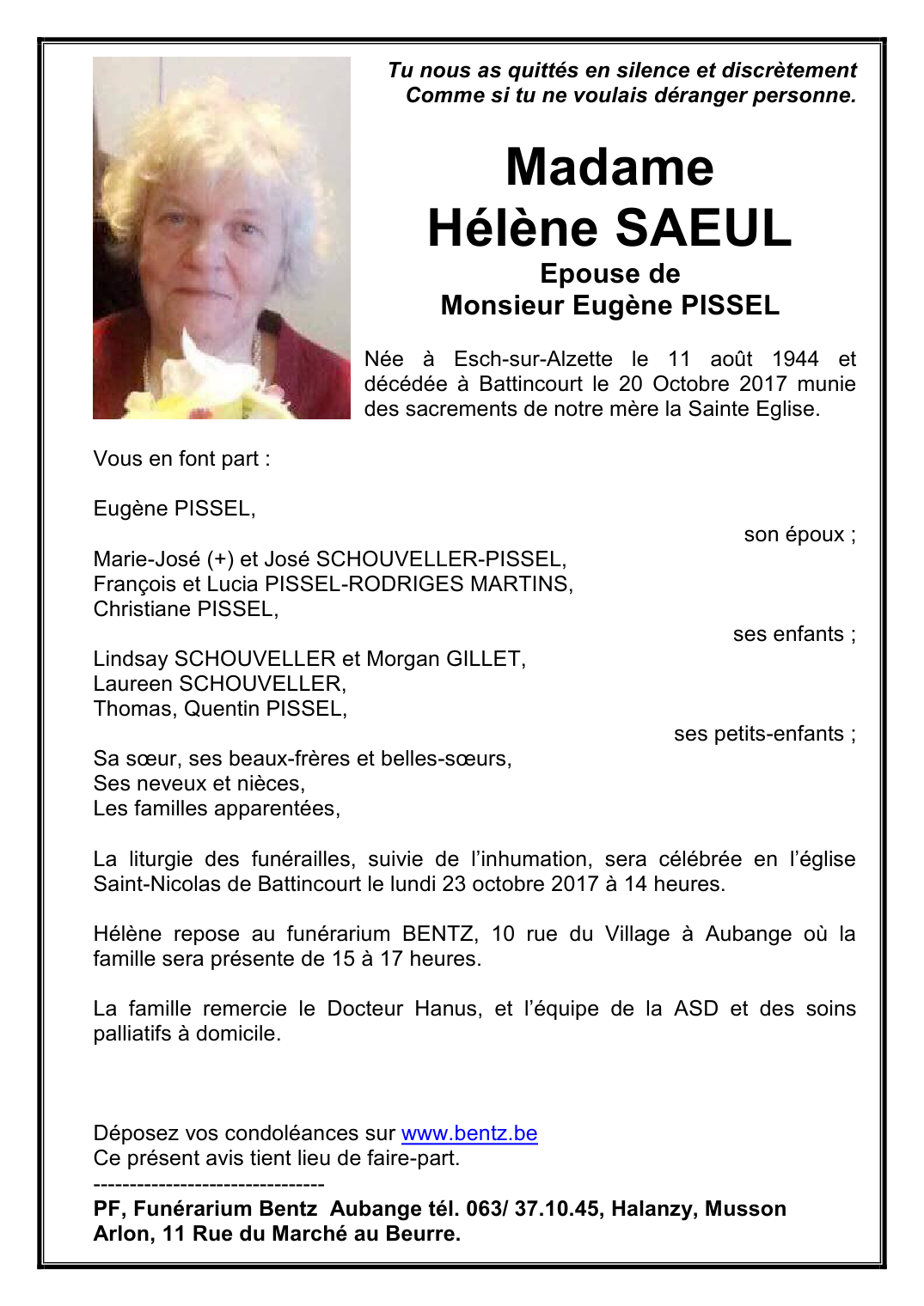 Décédée à Battincourt (6792) le vendredi 20 octobre 2017 à l'âge de 73 ans
