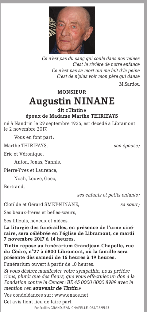 Décédé à Libramont (6800) le jeudi 2 novembre 2017 à l'âge de 82 ans