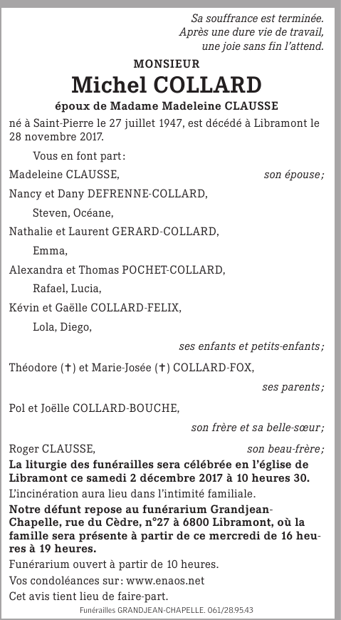 Décédé à Libramont (6800) le mardi 28 novembre 2017 à l'âge de 70 ans