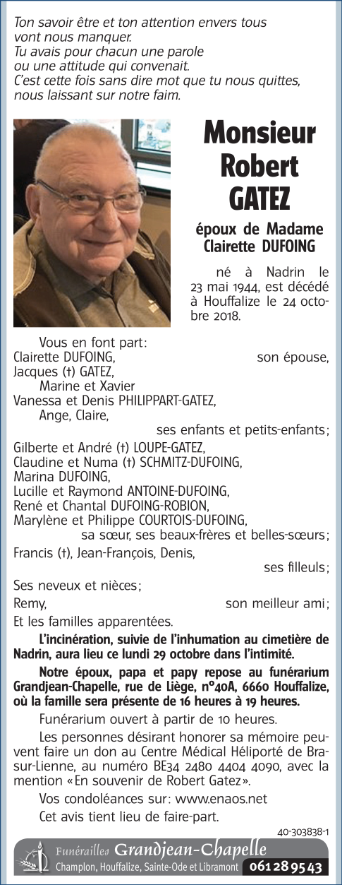Décédé à Houffalize (6660) le mercredi 24 octobre 2018 à l'âge de 74 ans