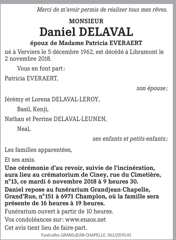 Décédé à Libramont (6800) le vendredi 2 novembre 2018 à l'âge de 55 ans
