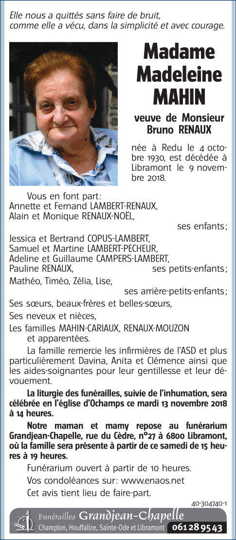 Décédée à Libramont (6800) le vendredi 9 novembre 2018 à l'âge de 88 ans