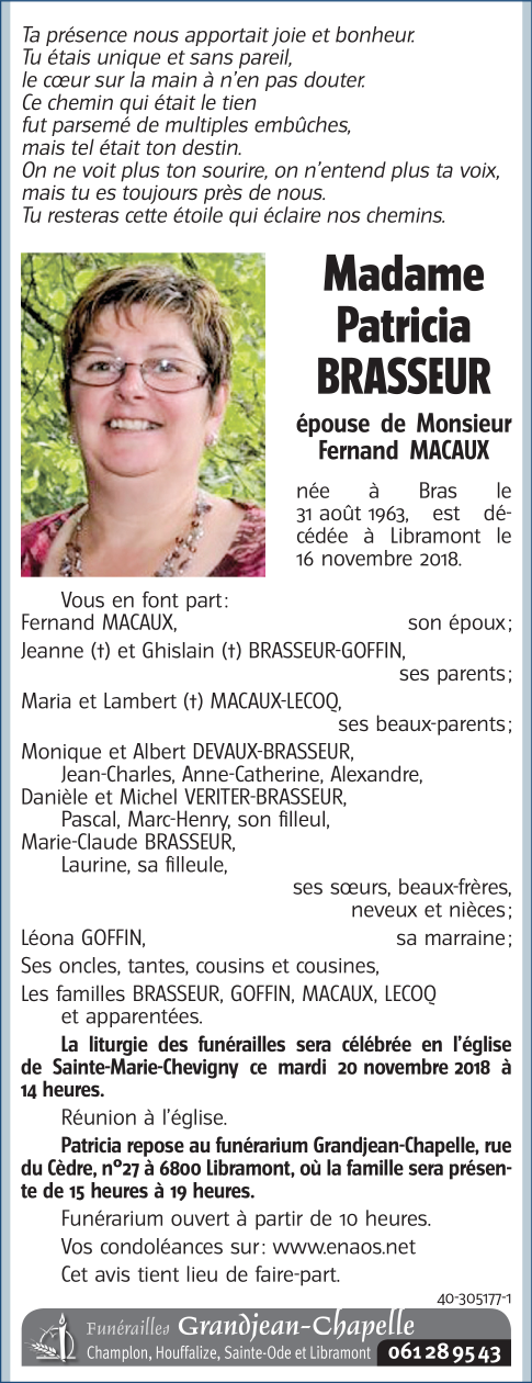 Décédée à Libramont (6800) le vendredi 16 novembre 2018 à l'âge de 55 ans