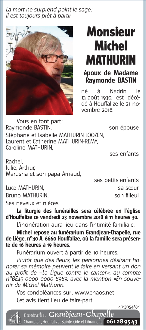 Décédé à Houffalize (6660) le mercredi 21 novembre 2018 à l'âge de 88 ans