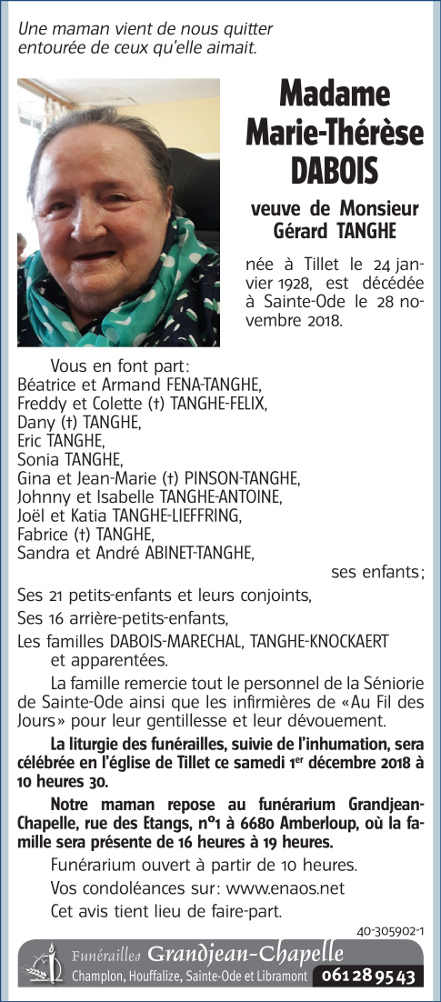 Décédée à Sainte-Ode (6680) le mercredi 28 novembre 2018 à l'âge de 90 ans
