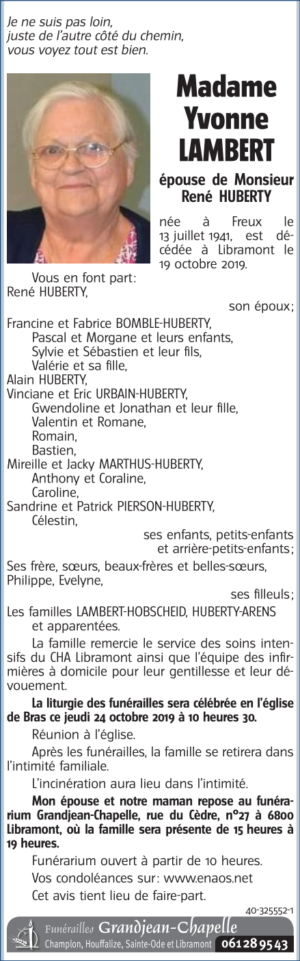 Décédée à Libramont (6800) le samedi 19 octobre 2019 à l'âge de 78 ans