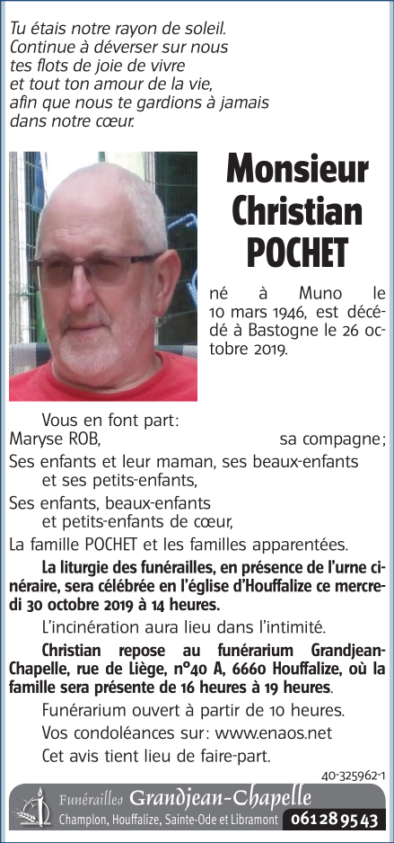 Décédé à Bastogne (6600) le samedi 26 octobre 2019 à l'âge de 73 ans