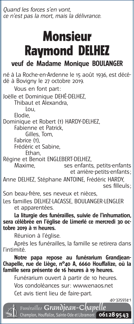 Décédé à Bovigny (6671) le dimanche 27 octobre 2019 à l'âge de 83 ans