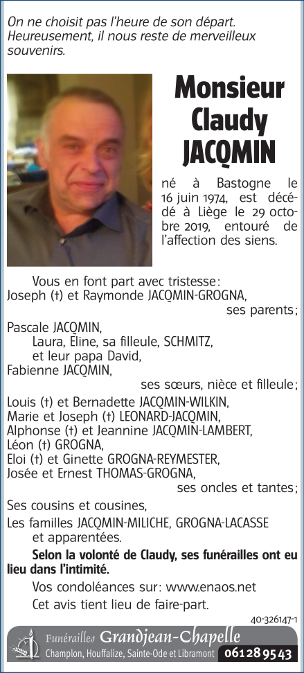 Décédé à Liège (4000) le mercredi 30 octobre 2019 à l'âge de 45 ans