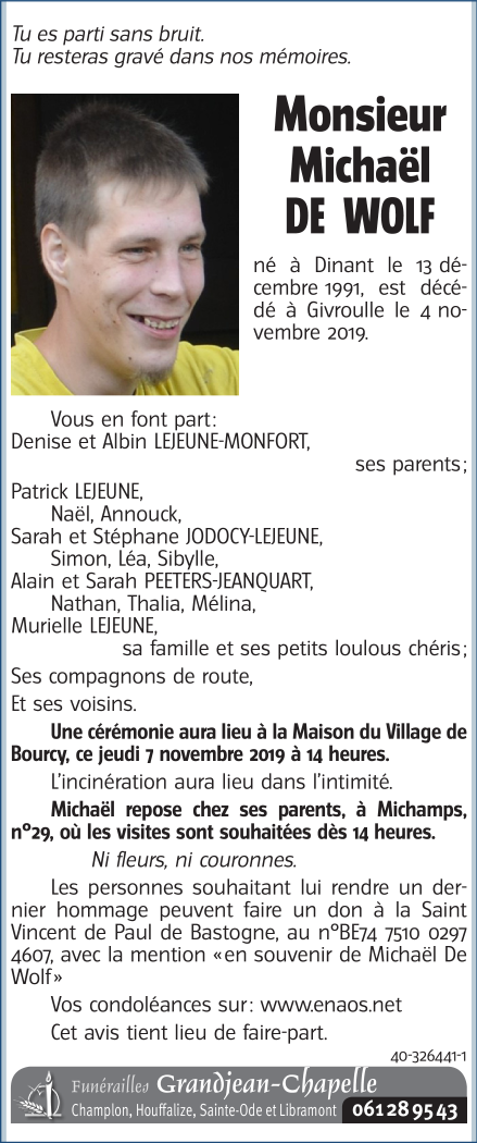Décédé à Givroulle (6680) le lundi 4 novembre 2019 à l'âge de 27 ans