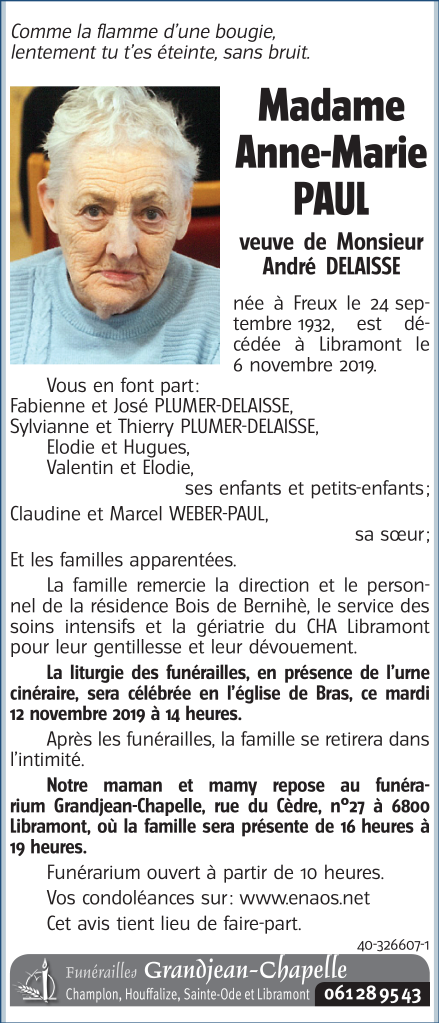 Décédée à Libramont (6800) le mercredi 6 novembre 2019 à l'âge de 87 ans