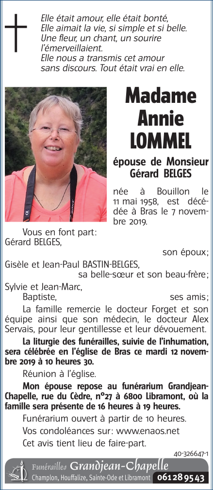 Née à Bouillon (6830) le dimanche 11 mai 1958