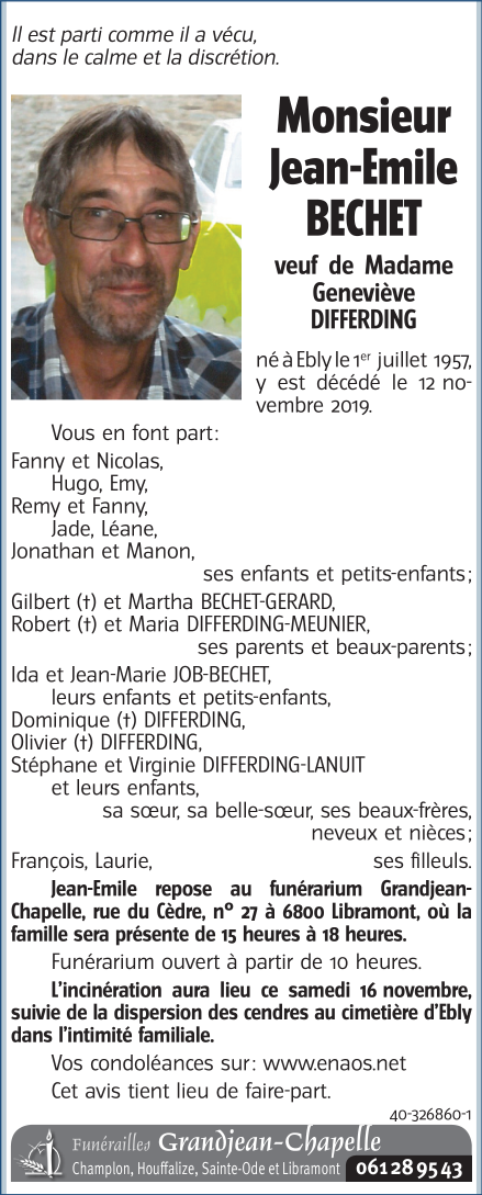 Décédé à Ebly (6860) le mardi 12 novembre 2019 à l'âge de 62 ans