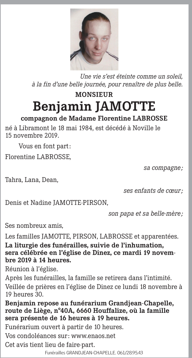 Décédé à Noville (Lux.) (6600) le vendredi 15 novembre 2019 à l'âge de 35 ans