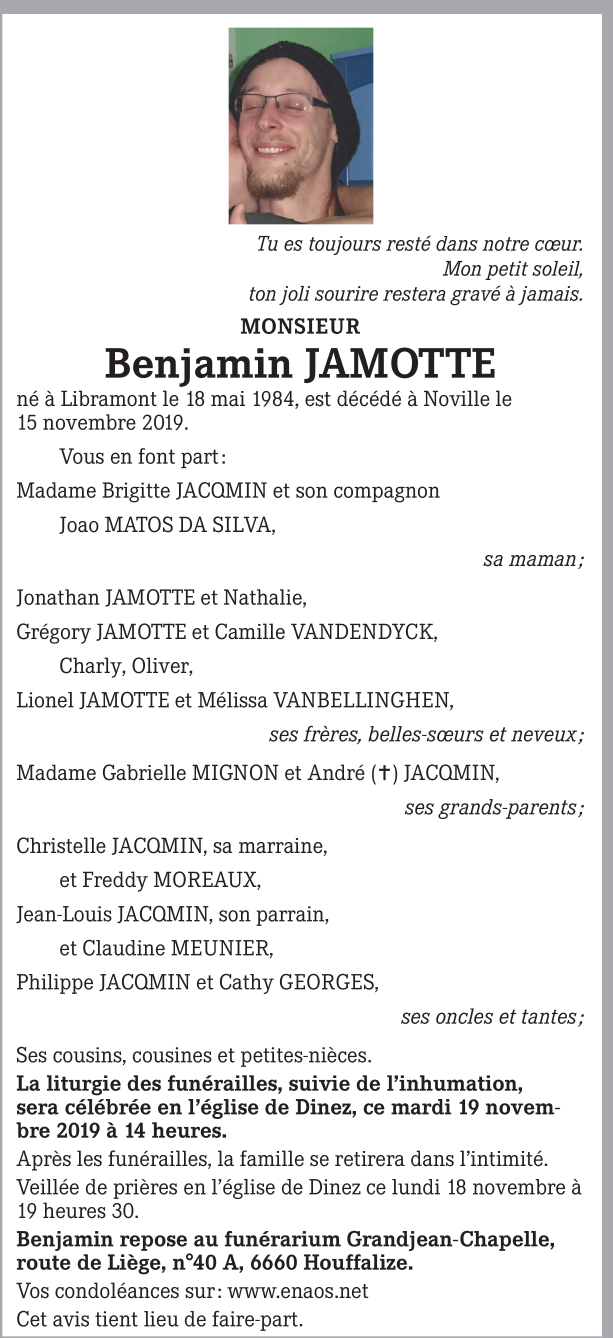 Décédé à Noville (Lux.) (6600) le vendredi 15 novembre 2019 à l'âge de 35 ans