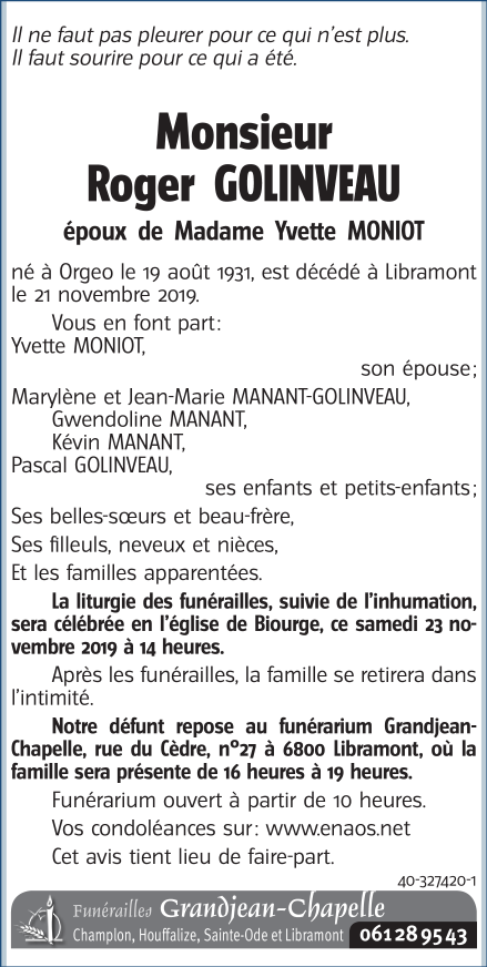 Décédé à Libramont (6800) le jeudi 21 novembre 2019 à l'âge de 88 ans
