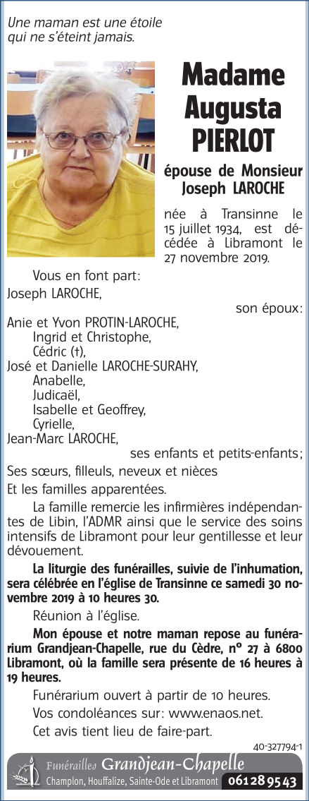 Décédée à Libramont (6800) le mercredi 27 novembre 2019 à l'âge de 85 ans