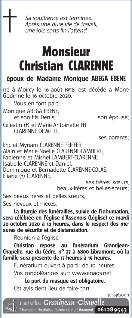 Décédé à Mont-Godinne (5530) le samedi 17 octobre 2020 à l'âge de 62 ans