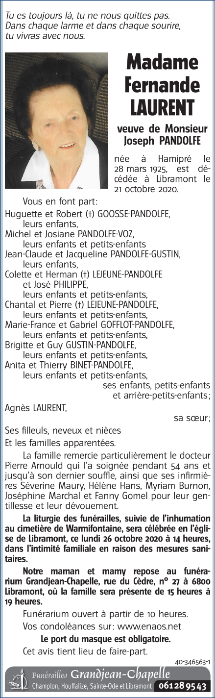 Décédée à Libramont (6800) le mercredi 21 octobre 2020 à l'âge de 95 ans