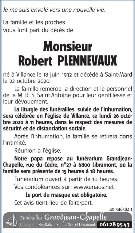 Décédé à Saint-Mard (6762) le jeudi 22 octobre 2020 à l'âge de 88 ans