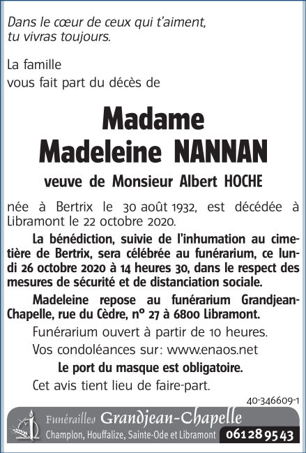 Décédée à Libramont (6800) le jeudi 22 octobre 2020 à l'âge de 88 ans
