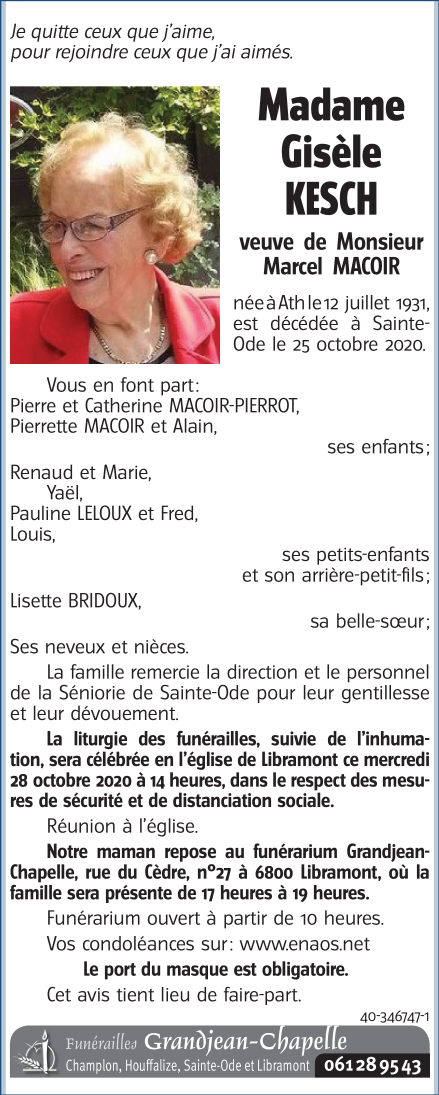 Décédée à Sainte-Ode (6680) le dimanche 25 octobre 2020 à l'âge de 89 ans