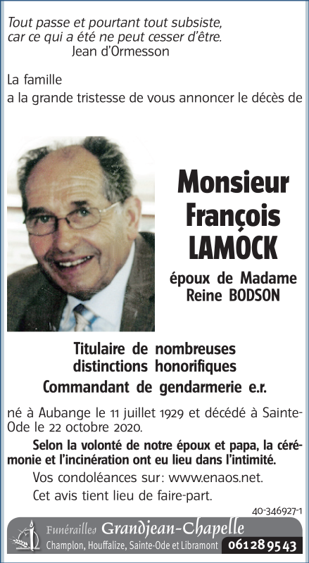 Décédé à Sainte-Ode (6680) le mardi 27 octobre 2020 à l'âge de 91 ans