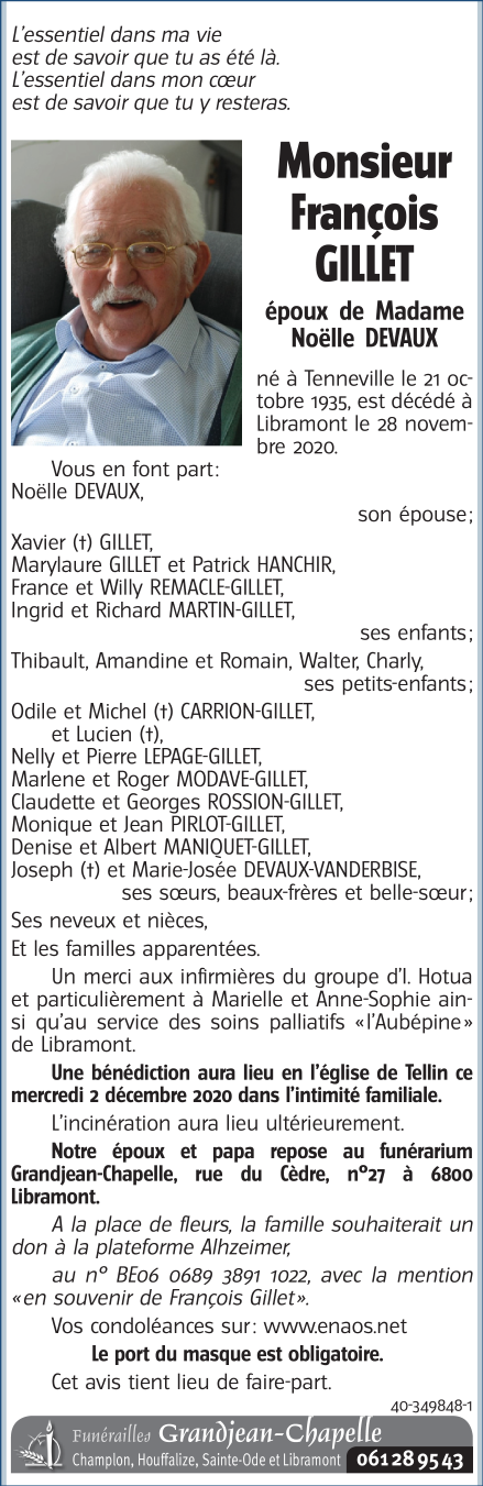 Décédé à Libramont (6800) le samedi 28 novembre 2020 à l'âge de 85 ans