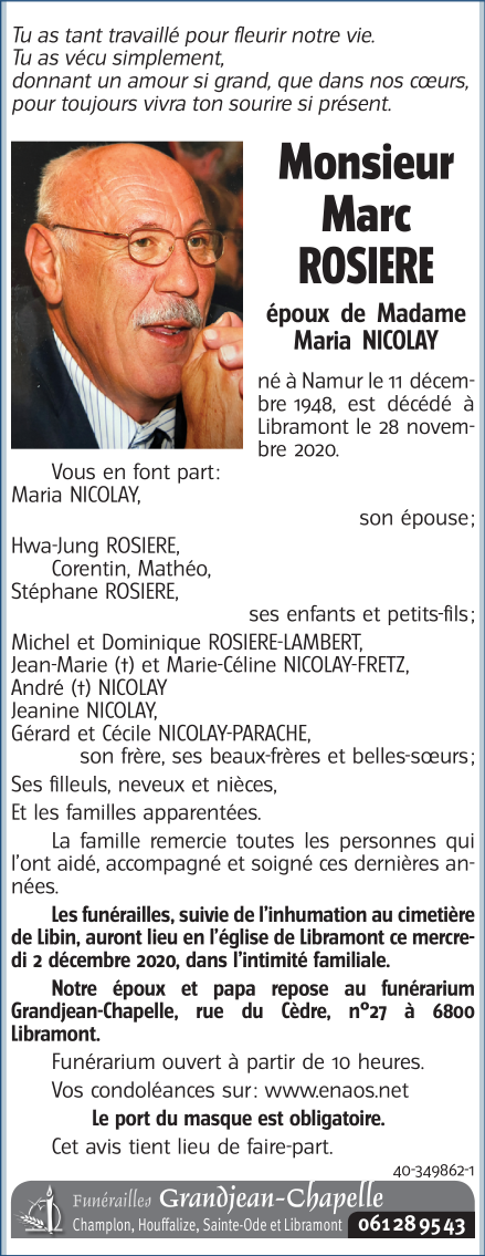 Décédé à Libramont (6800) le samedi 28 novembre 2020 à l'âge de 71 ans